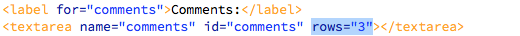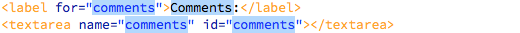 Toggle to Code View. Change the label to "Comments", and the name, ID, and "for" attribute to "comments".