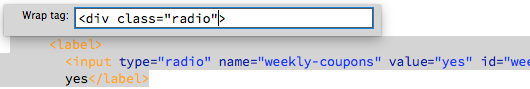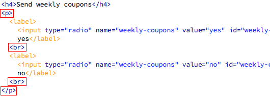 Moving down to the radio buttons, delete the <p> and <br> tags.