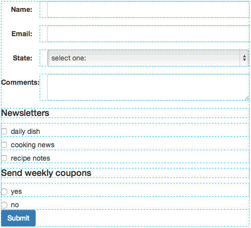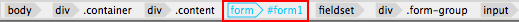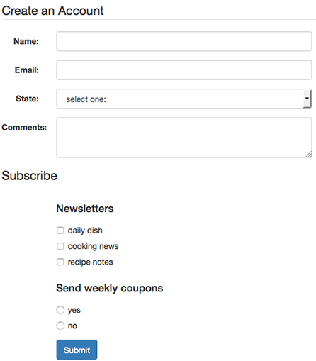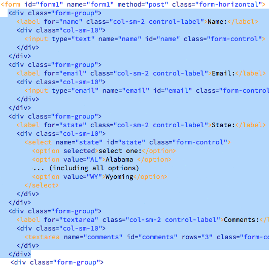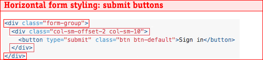 Like radio buttons and checkboxes, submit buttons are wrapped in two divs: "col-sm-offset-2 col-sm-10" and "form-group".
