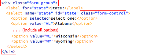 Select the "state" label, the select menu, and all the options in the select menu (including the </select> tag). Wrap in a div with a class of "form-group". Then, apply a class of "form-control" to the select menu.