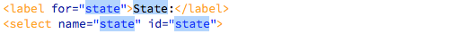 Toggle to Code View. Change the label to "State", and the name, ID, and "for" attribute to "state".