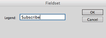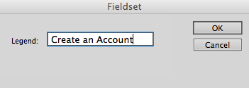 If the Fieldset dialog doesn't pop up, go to Dreamweaver > Preferences (or Edit > Preferences in Windows). In the General category, select "Show dialog when inserting form objects". |