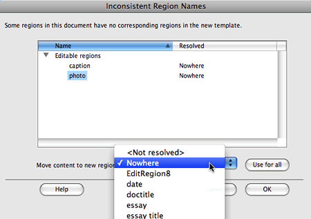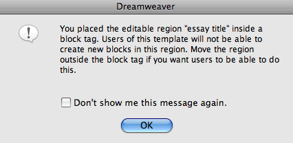 As long as you select the block element correctly before applying the editable region, you won't ever see the block tag alert. But if this problem does turn up, just switch to the Code view to manually reverse the tag order, so the block tag is inside the editable region.