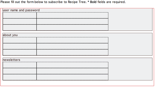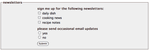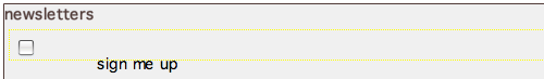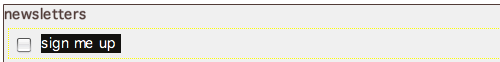 (or Insert > Form > Fieldset) to insert a new fieldset. Enter "sign me up for the following newsletters:" into the Legend field.