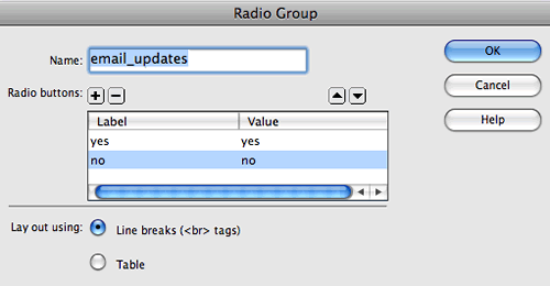 in the Insert panel. This opens a dialog in which you can program all of your radio buttons at once to avoid any naming mistakes.