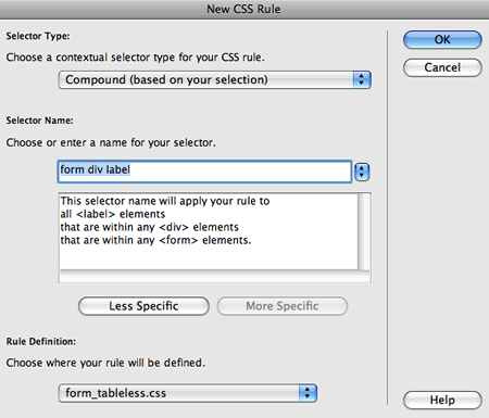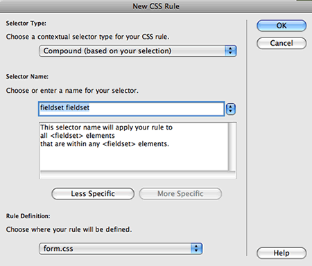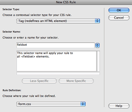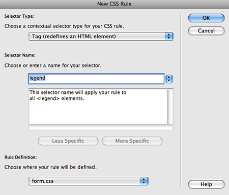 Start with the div—create a new CSS Rule and choose the Compound selector type (or Advanced in CS3). Type form