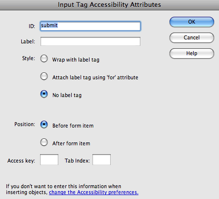 in the Insert panel, or Insert > Form > Button. Enter "submit" in the ID field and leave the label blank. Also, select No label tag from the style menu.