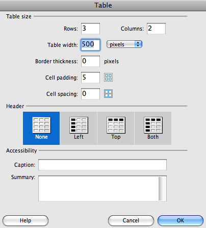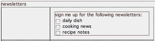 Click inside the upper-right cell of the "newsletters" table. We will use a nested fieldset in this cell to contain a series of checkboxes. Choose the Fieldset button