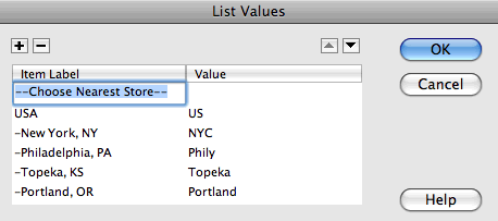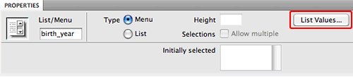 Select the drop-down menu and click the List Values button in the Property inspector to add the list items.