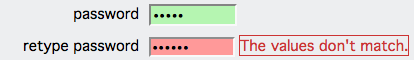 If your user is setting up a new account, you might want to use a Validation Confirm widget. After creating a new password, ask the user to retype the password. If the user fails to type the exact same password, the widget returns an error message stating that the values do not match. This will prevent any potential password errors—maybe your user thought he typed "tomato", but really, he typed "tomatoo".