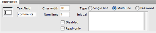 in the Insert panel (or Insert > Form > Textarea). Give the text area an ID of "comments" and a label of "comments".