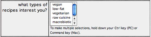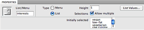 List boxes bear a distinct similarity to drop-down menus. So much so that they share the same insert button, Property inspector options, and List Values window. The difference? A list box can be several lines long, and it allows for multiple choices if the user holds down the Ctrl key (PC) or Command key (Mac). In fact, it's helpful to remind the user of these keys with instructions such as "To make multiple selections, hold down your Ctrl key (PC) or Command key (Mac)."
