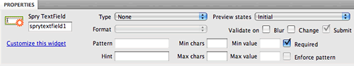 Choose Required from the Preview states menu in the Property inspector. If your user forgets to fill in this field, he or she will get a default error message "A value is required." Enter something more user friendly, like "Please enter your name."