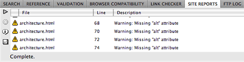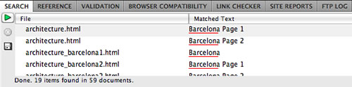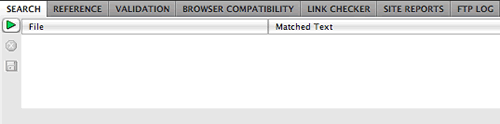 The Results panel (Window > Results) exists to generate reports on an entire site—from broken links to redundant code to browser compatibility. Each tab of the panel handles a different function accessed by the green play button on the left. You can use the Results panel to check your site for potential problems and speed up any fixes you need to make.