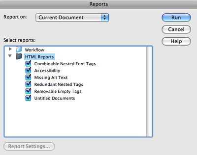 The Accessibility report refers to site accessibility guidelines for visually impaired users. You can refine the types of accessibility suggestions offered by this report by selecting Accessibility and clicking Report Settings.