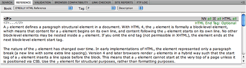 The Validation tab is handy for code purists who want to make sure that their code is legitimate by current standards. Clicking the green play button gives you a choice of whether to validate the entire site or just the current page. You can also change your validation settings (choose the Validator category of the Preferences window).