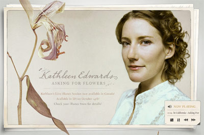 Click here to see a splash animation for singer/songwriter Kathleen Edwards. It creates a dramatic entry point with image, animation, and music that conveys the artist's