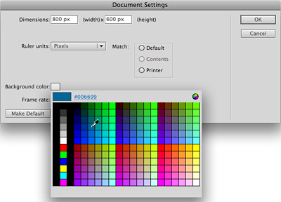 This is where the visual layout of a Flash movie occurs. You can think of it as the screen for viewing a Flash piece, which can be set to any size you desire. It's one of many metaphors that Flash borrows from the theater, film, and traditional animation. Flash animations, for instance, are usually called movies. Each movie is composed of a series of units of time called frames. The Stage you see above is where it all comes together; you can compose each frame of your movie by drawing directly on it, importing artwork, and moving it around to create the optimal composition.