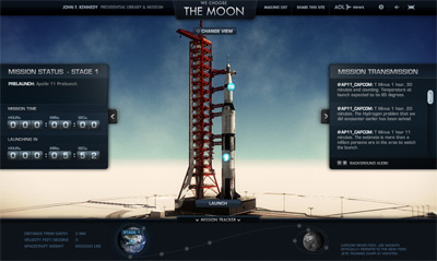 Domani Studios created We Choose the Moon for to commemorate the Apollo 11 moon mission. The site recreated the mission precisely 40 years (to the minute) from the actual Apollo 11 mission, including rocket takeoff. |