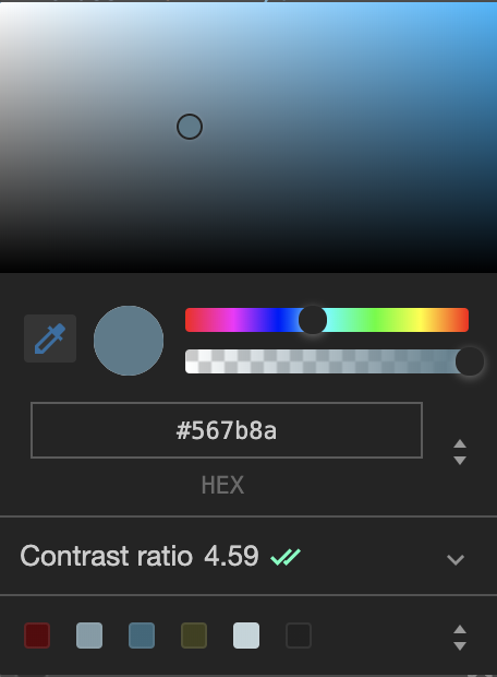 If I move the circle in the color picker down to choose a darker shade, the "no" icon goes away. This darker shade has enough contrast to pass the test. I can copy and paste the HEX value into my style.css to update my design.