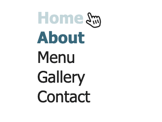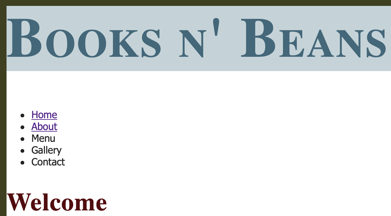 Check out the Books n' Beans header, menu, and Welcome text pictured above. The page headings have been changed to a deep blue and I've added a letter-spacing of 2px to give the headings an airy feel, and I've used the font-variant property "small-caps" for a professional, distinguished look.