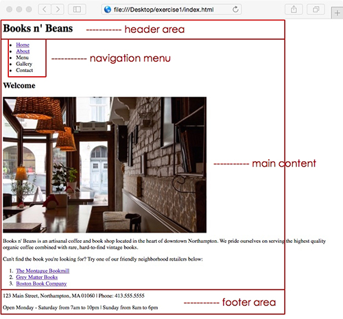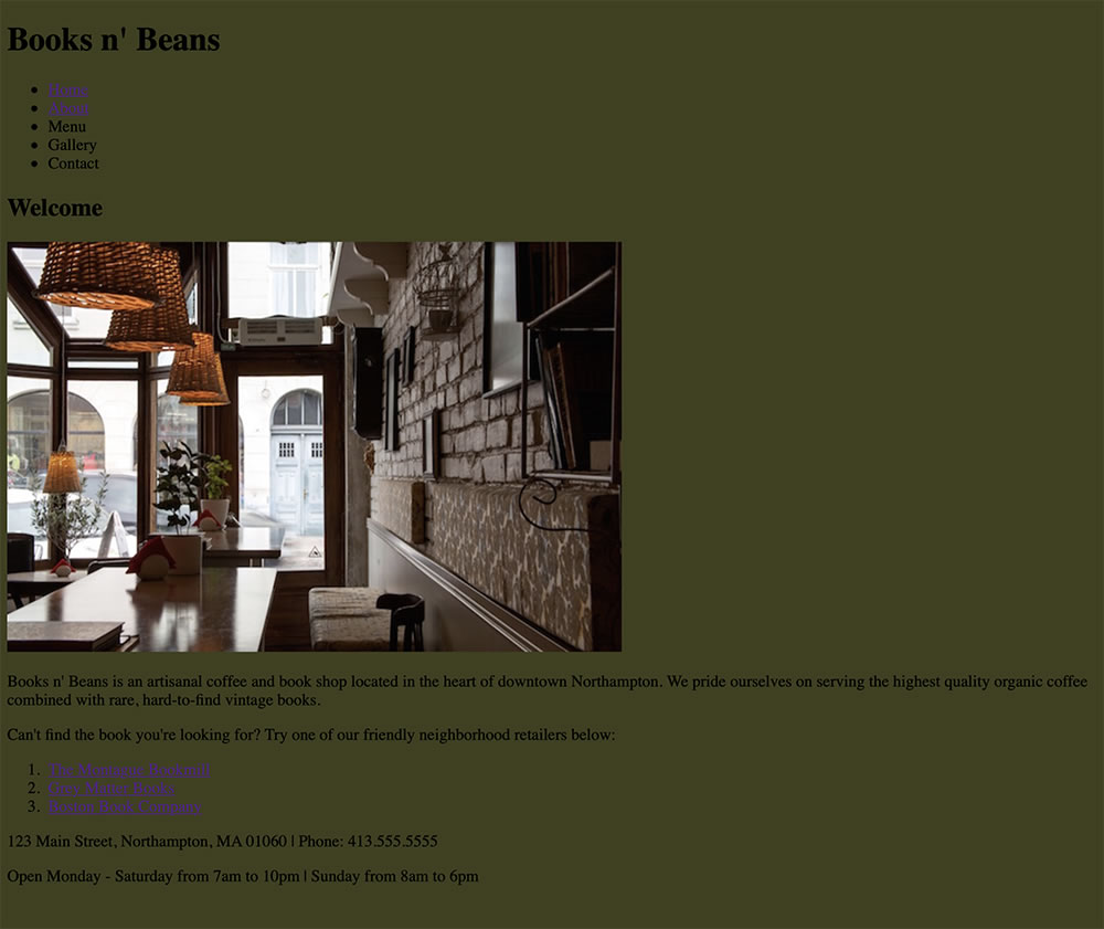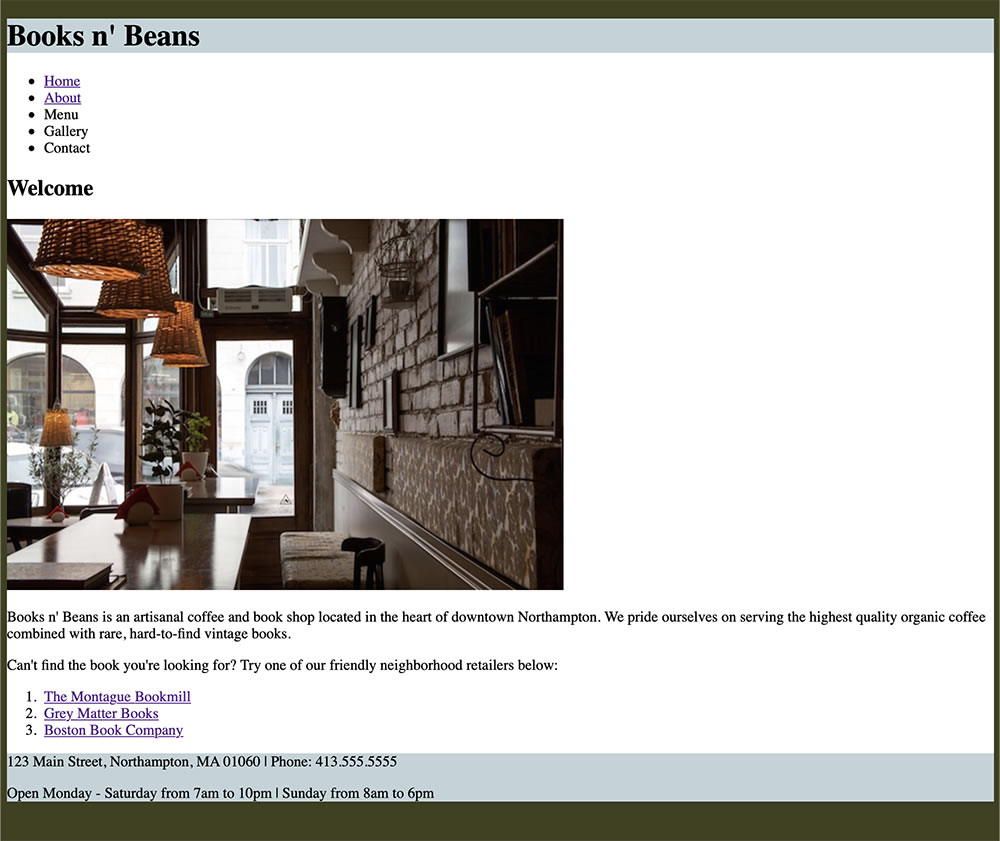 <div class="main"> <h2>Welcome</h2> <img src="images/coffee-shop.jpg" alt=""> <p>Books n' Beans is an artisanal coffee...</p> <p>Can't find the book ...</p> <ol> <li><a href="http://www.montaguebookmill.com/">The Montague Bookmill</a></li> <li><a href="http://www.greymatterbookstore.com/">Grey Matter Books</a></li> <li><a href="http://www.rarebook.com/">Boston Book Company</a></li> </ol> </div>