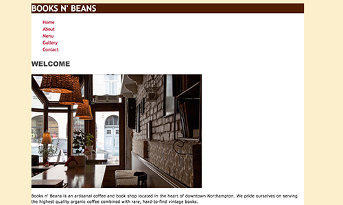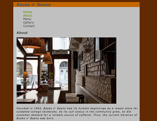 Our Books n' Beans site is well on its way, and we'll be expanding on its layout design in the next exercise. For now, I look forward to seeing your work!