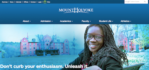 The Mt. Holyoke College website displays a large blue header area at the top of the page with a centered horizontal navigation menu beneath a centered logo. There's also a small, left-aligned secondary navigation menu at the very top of the page. You've probably seen many variations of this layout before!
