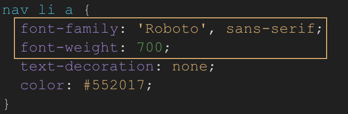 Let's choose a different color for the links and remove those link underlines! We'll do that using a descendant selector that targets the anchor links inside the nav: