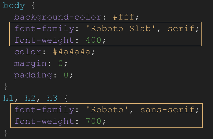 Add the font names to your CSS styles just as you would with any other font. I chose "Roboto Slab" as the body font in a regular "400" font-weight, and the sans-serif version of Roberto for links and headings, in the bolder "700" font weight.