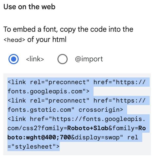 Next, you need to tell the browser where you want the fonts to display. Copy one of the CSS rules to specify families: