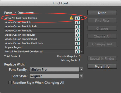 In the Find Font dialog, select the font(s) with the yellow warning icon next to it.