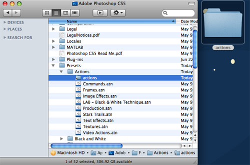 Once you have created the directory to hold your actions, you need to tell Photoshop to look there for actions. Windows users, make a shortcut to the new folder, and Mac users, make an alias of the new folder. Then drag the shortcut or alias into the application folder that contains Photoshop actions by default (usually C:/Program Files/Adobe/Adobe Photoshop CS5/Presets/Actions on Windows and Applications/Adobe Photoshop CS5/Presets/Actions on Mac).