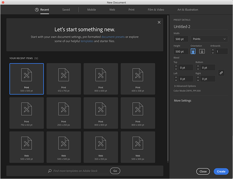 In Illustrator, create a new document (File > New) with pixels as the unit of measurement. Set the width and height to 500px and click OK. In my line of work, those settings (along with choosing portrait or landscape for the document's orientation) are what I use most. The others I rarely touch.