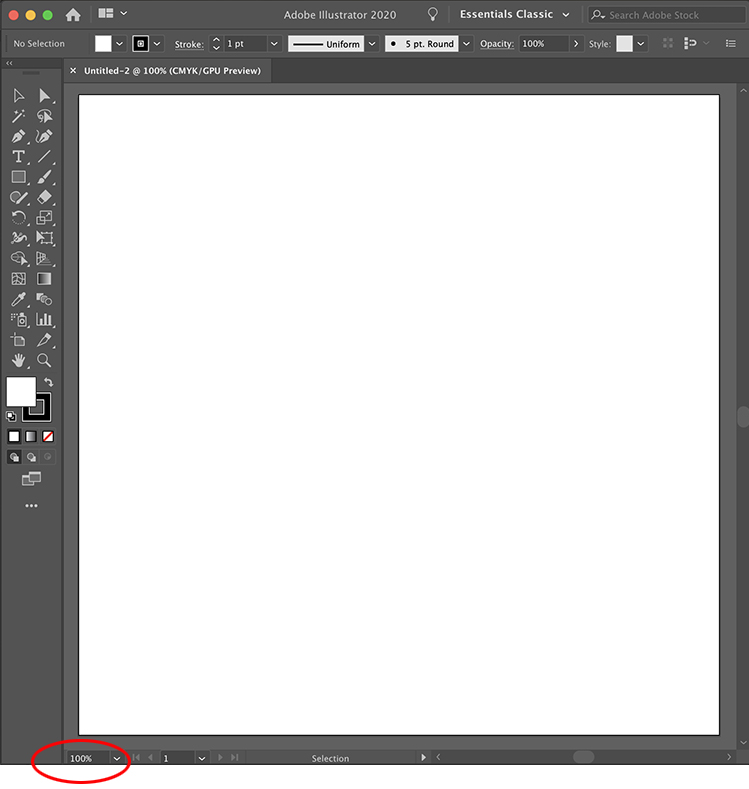 Right out of the gate, double-click the Zoom tool in the toolbar to ensure you're viewing the document at 100% zoom. For whatever reason, with certain Artboard sizes, Illustrator likes to zoom in. This can throw you off the more you work on a design. To further confirm, you can always see the zoom percentage in the document's title bar or down in the lower-left corner.