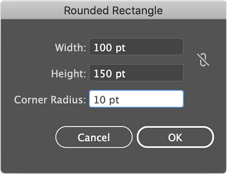 Select the Rounded Rectangle tool in the toolbar (it's hidden beneath the Rectangle tool by default) and click once in your Artboard to display the tool's options. For the moment, use the values shown and click OK.