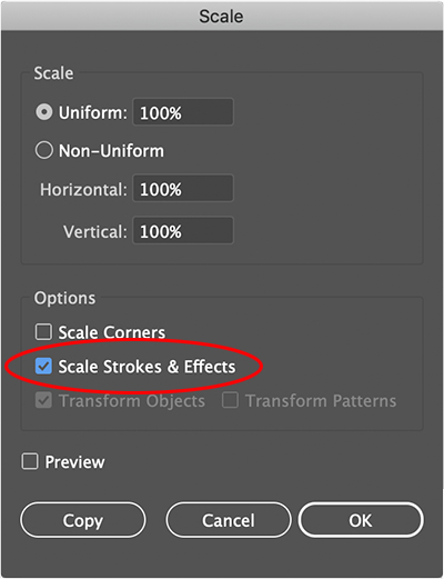 Once we drew that first sentence line, the weight was set to 10px. Remember that? Well, without a setting enabled, the strokes remain 10px either if they are scaled up or down. If you resized the icon, revert back to its original size via Edit > Undo. To fix the too-thick lines, double-click the Scale tool in the toolbar and make sure the "Scale Strokes > Effects" option is enabled.