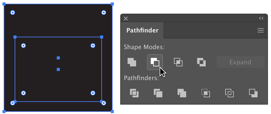 Open the handy Pathfinder Panel and click the Minus Front command. The two white shapes will disappear and leave holes in the black square.