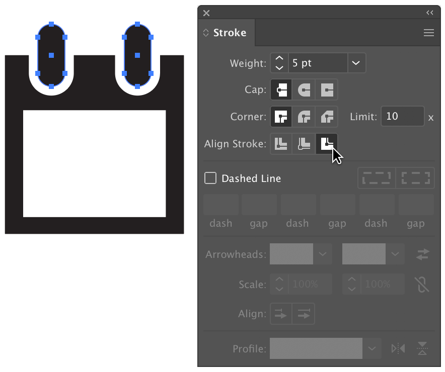 The strokes will be used to knock out holes in the upper part of the rectangle shape. Select both rounded rectangles and go to Object > Path > Outline Stroke. This converts the strokes to regular objects.