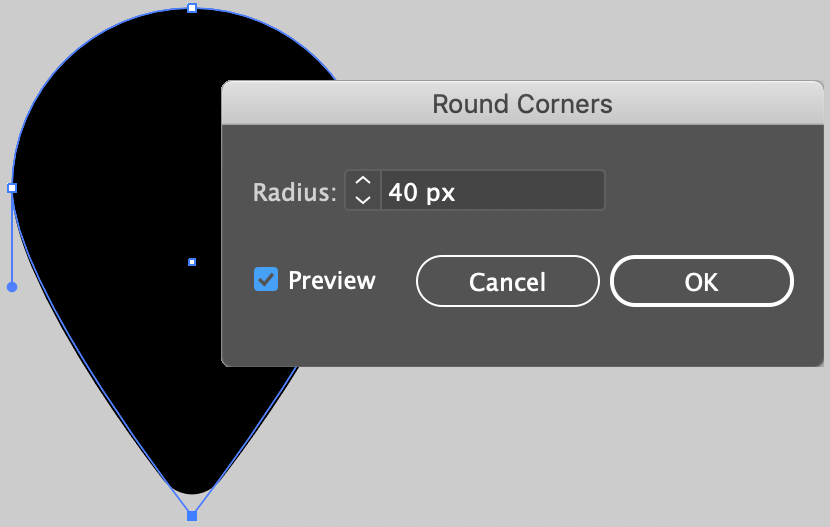 Drag a selection marquee, using the Direct Selection Tool, around this bottom point. Go to Effect > Stylize > Round Corners. Enter a value for your shape that rounds the bottom to look similar to what I have here. Your shape may be either larger or smaller than the one I have so adjust the value accordingly.