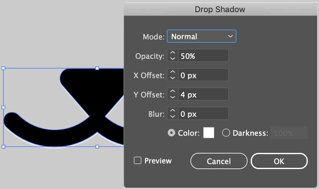 Let's add a little effect to this face that gives it an incised look. Select the mouth/nose shape and go to Effect > Stylize > Drop Shadow. Enter the values shown and click OK. If you shapes are larger or smaller than mine, you may need to adjust these values.
