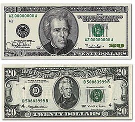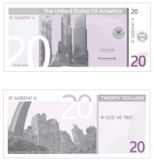 | This 20 dollar bill, designed by Sessions student Kate Caryk, uses clean typography, negative space, and minimal color to create a modern bank note indicative of the United States of America. |