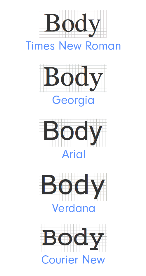 System fonts include Time News Roman, Georgia, Arial, Verdana, and Courier New. Each of these fonts should be familiar to you: