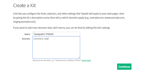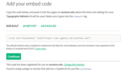 Earlier I mentioned that web fonts were connected to your page using some code. This is the page where you view the different ways to embed the font. You can just leave this set to default. Press Continue.
