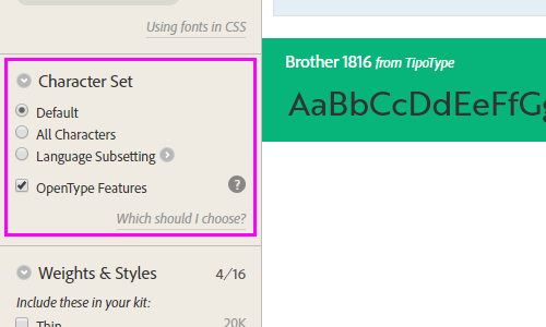 Just under the Selectors section is an area where you can decide what characters you'll need in the font. If you plan on using the font for your body text then having access to all possible characters might be good because it will give you access to not just numbers and letters but also some symbols or glyphs that are part of the font.