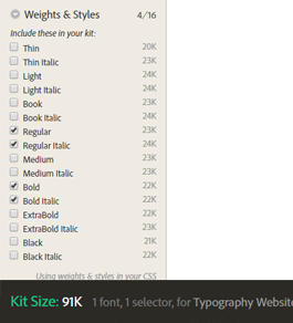 Finally, we can select the weight and style of the font. Before you decide to take all of them, remember that using many web fonts can slow down the loading of the page. Usually at this point you should already have an idea of what font weights you need but if you're following along just pick some random styles. At the bottom you will be shown the size of your selection. It gets bigger with the more weights or styles you add. You can always edit a kit after you make it if you change your mind.