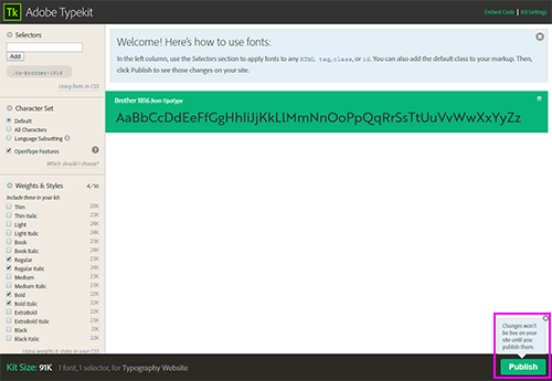 If you change your mind or need to update, Typekit makes it easy to edit, delete or republish the kit. |