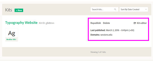 If you need to make changes to your kit at any time, you can click the link near the top right of the main page labeled Kits. Clicking on the link will take you to a list of your active kits. You can delete any kits you do not wish to use or edit a kit's name, domain, and fonts.