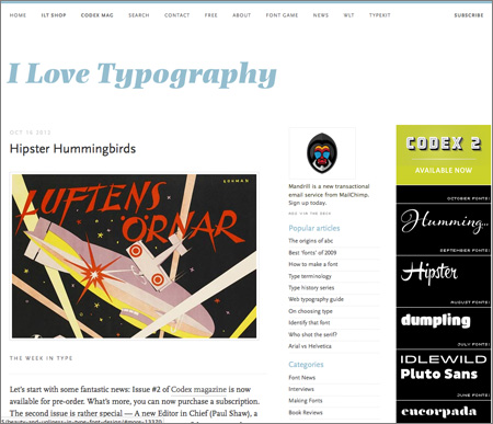 Hey, who doesn't love typography? Whereas Upstart Blogger focused on a single, sans-serif typeface, the I Love Typography site combines serifs and sans-serifs beautifully for contrast and hierarchy.