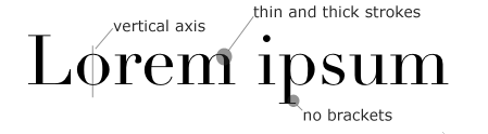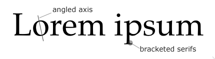 Garald style type, also known as Old Style, was at its height during the Renaissance. Palatino (shown below) is an example of a Garald typeface. It is characterized as such because of the angled axis of the "o" (it looks tilted), and the bracketed serifs. A bracket is the small wedge or curve where the stem of the letter meets the serif.